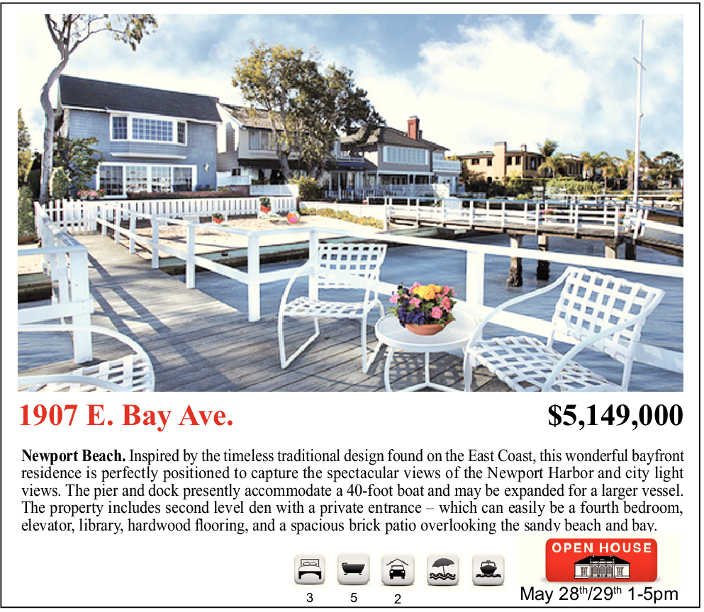 Newport Beach. Inspired by the timeless traditional design found on the East Coast, this wonderful bayfront residence is perfectly positioned to capture the spectacular views of the Newport Harbor and city light views. The pier and dock presently accommodate a 40-foot boat and may be expanded for a larger vessel. The property includes second level den with a private entrance – which can easily be a fourth bedroom, elevator, library, hardwood flooring, and a spacious brick patio overlooking the sandy beach and bay.