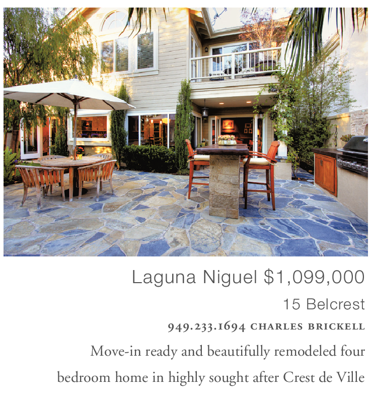 Laguna Niguel $1,099,000 15 Belcrest 949.233.1694 charles brickell Move-in ready and beautifully remodeled four bedroom home in highly sought after Crest de Ville