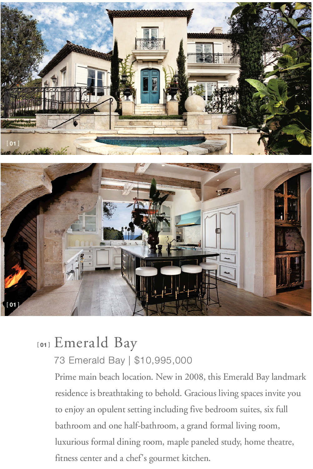 [ 01 ] [ 01 ] [ 01 ] Emerald Bay 73 Emerald Bay | $10,995,000 Prime main beach location. New in 2008, this Emerald Bay landmark residence is breathtaking to behold. Gracious living spaces invite you to enjoy an opulent setting including five bedroom suites, six full bathroom and one half-bathroom, a grand formal living room, luxurious formal dining room, maple paneled study, home theatre, fitness center and a chef's gourmet kitchen.