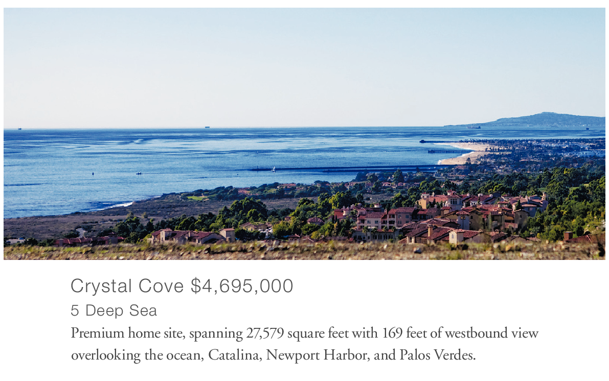 Crystal Cove $4,695,000 5 Deep Sea Premiumhomesite,spanning27,579squarefeetwith169feetofwestboundview overlooking the ocean, Catalina, Newport Harbor, and Palos Verdes.