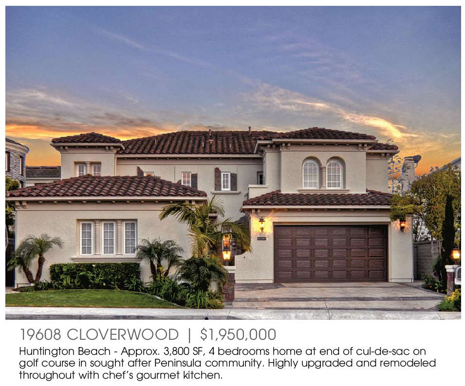 19608 CLOVERWOOD | $1,950,000 Huntington Beach - Approx. 3,800 SF, 4 bedrooms home at end of cul-de-sac on golf course in sought after Peninsula community. Highly upgraded and remodeled throughout with chef’s gourmet kitchen.
