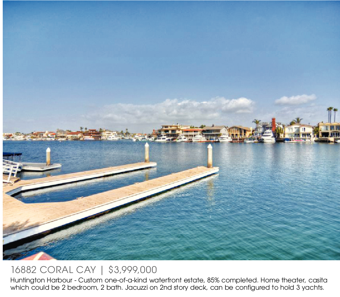 16882 CORAL CAY | $3,999,000 Huntington Harbour - Custom one-of-a-kind waterfront estate, 85% completed. Home theater, casita which could be 2 bedroom, 2 bath. Jacuzzi on 2nd story deck, can be configured to hold 3 yachts.