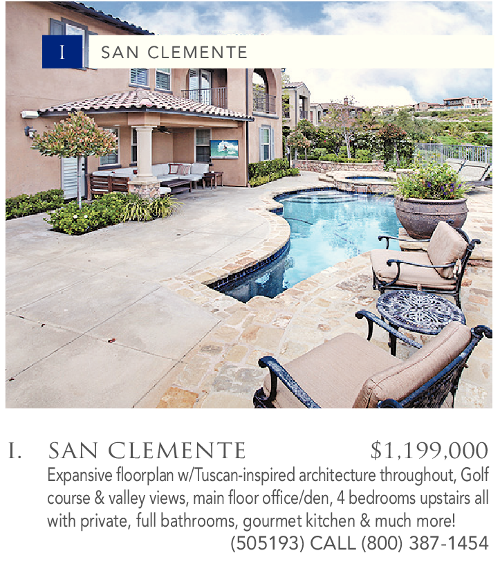 I. I SAN CLEMENTE SAN CLEMENTE $1,199,000 Expansive floorplan w/Tuscan-inspired architecture throughout, Golf course & valley views, main floor office/den, 4 bedrooms upstairs all with private, full bathrooms, gourmet kitchen & much more! (505193) CALL (800) 387-1454