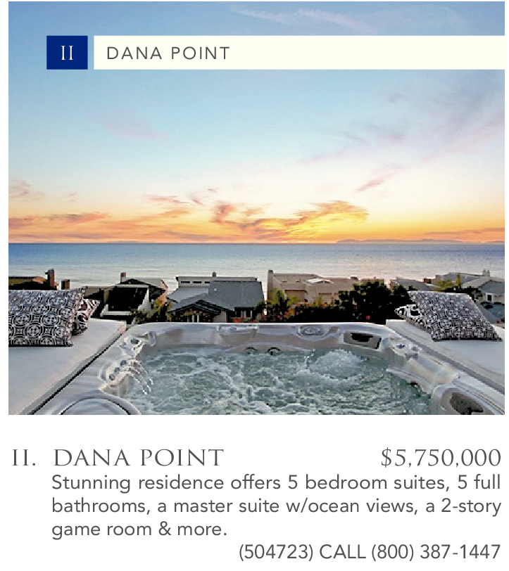 DANA POINT $5,750,000 Stunning residence offers 5 bedroom suites, 5 full bathrooms, a master suite w/ocean views, a 2-story game room & more.