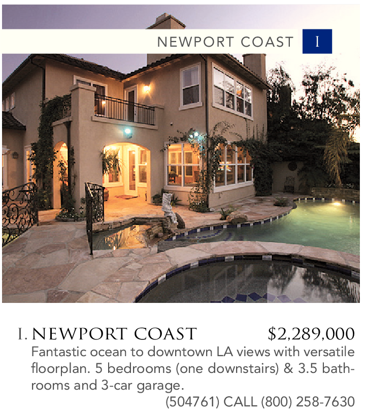 I. NEWPORT COAST $2,289,000 Fantastic ocean to downtown LA views with versatile floorplan. 5 bedrooms (one downstairs) & 3.5 bathrooms and 3-car garage.