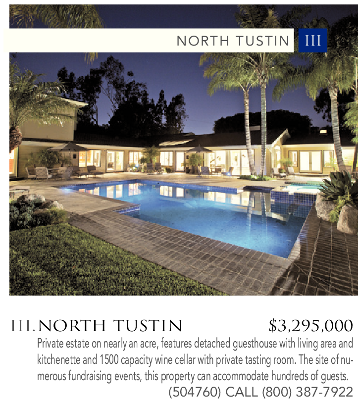 III. NORTH TUSTIN $3,295,000 Private estate on nearly an acre, features detached guesthouse with living area and kitchenette and 1500 capacity wine cellar with private tasting room. The site of numerous fundraising events, this property can accommodate hundreds of guests. (504760) CALL (800) 387-7922 NORTH TUSTIN III