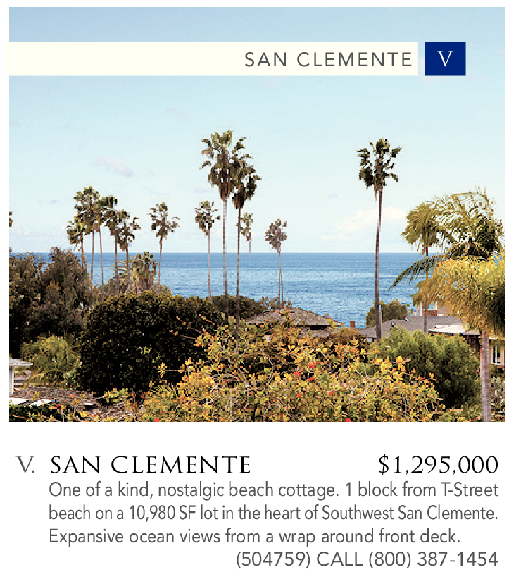 SAN CLEMENTE V V. SAN CLEMENTE $1,295,000 One of a kind, nostalgic beach cottage. 1 block from T-Street beach on a 10,980 SF lot in the heart of Southwest San Clemente. Expansive ocean views from a wrap around front deck. (504759) CALL (800) 387-1454