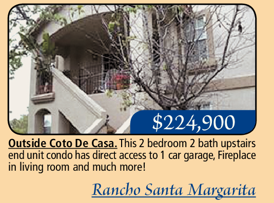Outside Coto De Casa. This 2 bedroom 2 bath upstairs end unit condo has direct access to 1 car garage, Fireplace in living room and much more!