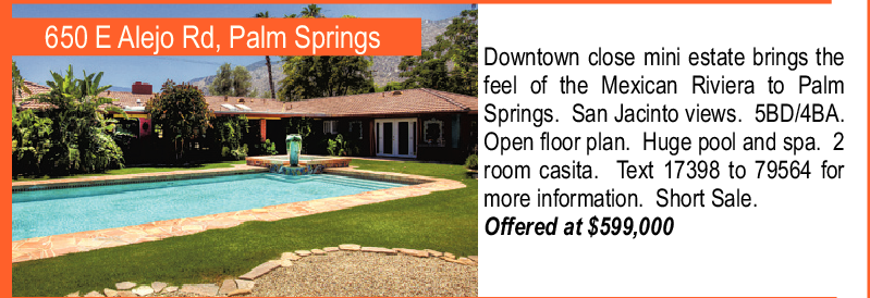 650 E Alejo Rd, Palm Springs Downtown close mini estate brings the feel of the Mexican Riviera to Palm Springs. San Jacinto views. 5BD/4BA. Open floor plan. Huge pool and spa. 2 room casita. Text 17398 to 79564 for more information. Short Sale. Offered at $599,000