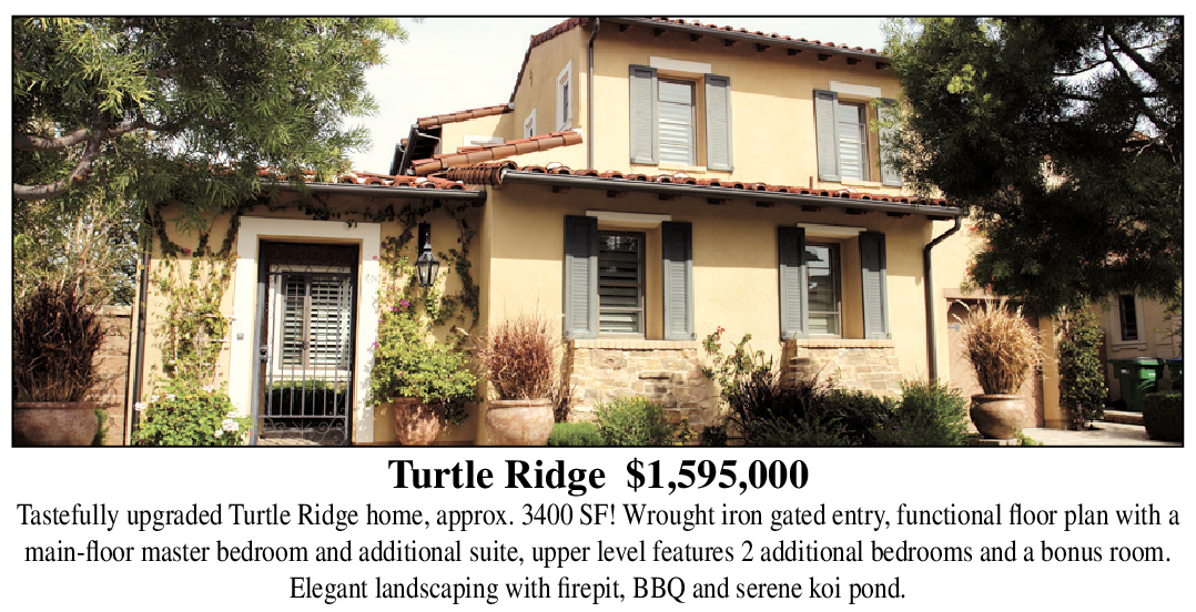 Turtle Ridge $1,595,000 Tastefully upgraded Turtle Ridge home, approx. 3400 SF! Wrought iron gated entry, functional floor plan with a main-floor master bedroom and additional suite, upper level features 2 additional bedrooms and a bonus room. Elegant landscaping with firepit, BBQ and serene koi pond.