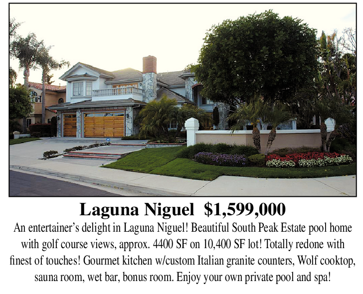 Laguna Niguel $1,599,000 An entertainer’s delight in Laguna Niguel! Beautiful South Peak Estate pool home with golf course views, approx. 4400 SF on 10,400 SF lot! Totally redone with finest of touches! Gourmet kitchen w/custom Italian granite counters, Wolf cooktop, sauna room, wet bar, bonus room. Enjoy your own private pool and spa!
