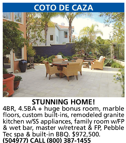 COTO DE CAZA STUNNING HOME! 4BR, 4.5BA + huge bonus room, marble floors, custom built-ins, remodeled granite kitchen w/SS appliances, family room w/FP & wet bar, master w/retreat & FP, Pebble Tec spa & built-in BBQ. $972,500. (504977) CALL (800) 387-1455