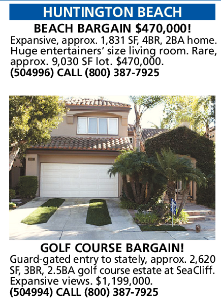 FP, development, floors, HUNTINGTON BEACH BEACH BARGAIN $470,000! Expansive, approx. 1,831 SF, 4BR, 2BA home. Huge entertainers’ size living room. Rare, approx. 9,030 SF lot. $470,000. (504996) CALL (800) 387-7925 GOLF COURSE BARGAIN! Guard-gated entry to stately, approx. 2,620 SF, 3BR, 2.5BA golf course estate at SeaCliff. Expansive views. $1,199,000. (504994) CALL (800) 387-7925
