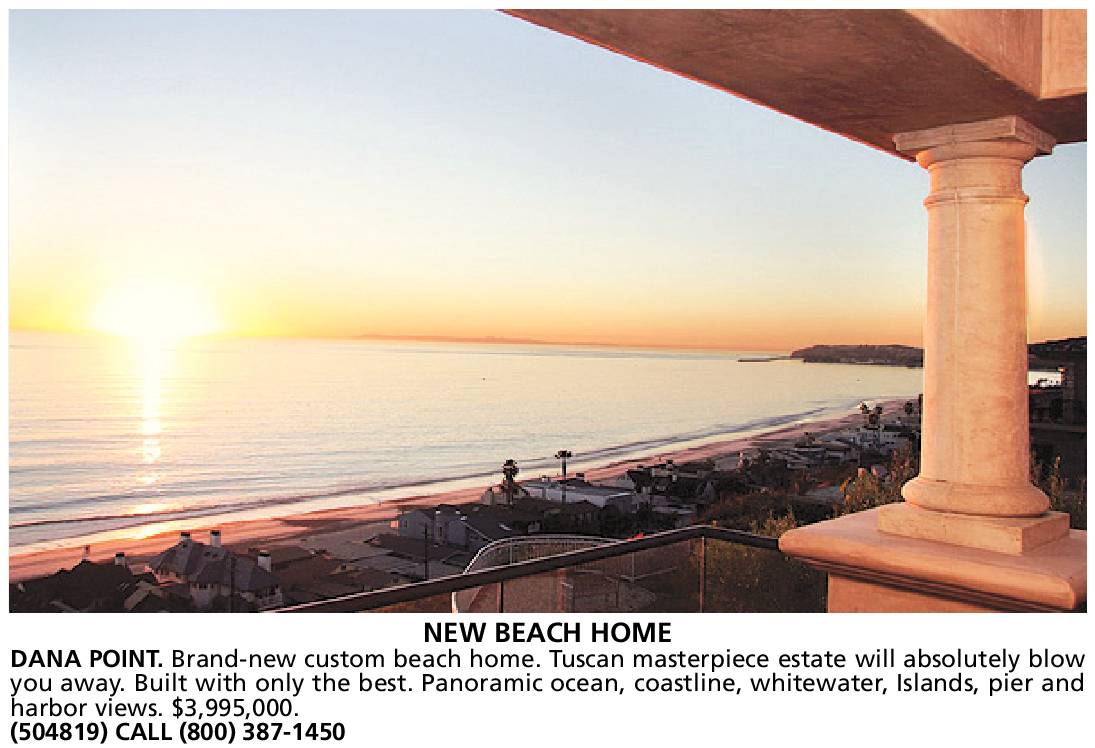 NEW BEACH HOME DANA POINT. Brand-new custom beach home. Tuscan masterpiece estate will absolutely blow you away. Built with only the best. Panoramic ocean, coastline, whitewater, Islands, pier and harbor views. $3,995,000. (504819) CALL (800) 387-1450