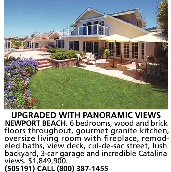 UPGRADED WITH PANORAMIC VIEWS NEWPORT BEACH. 6 bedrooms, wood and brick floors throughout, gourmet granite kitchen, oversize living room with fireplace, remodeled baths, view deck, cul-de-sac street, lush backyard, 3-car garage and incredible Catalina views. $1,849,900. (505191) CALL (800) 387-1455
