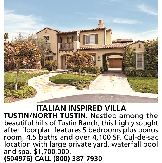 ITALIAN INSPIRED VILLA TUSTIN/NORTH TUSTIN. Nestled among the beautiful hills of Tustin Ranch, this highly sought after floorplan features 5 bedrooms plus bonus room, 4.5 baths and over 4,100 SF. Cul-de-sac location with large private yard, waterfall pool and spa. $1,700,000.