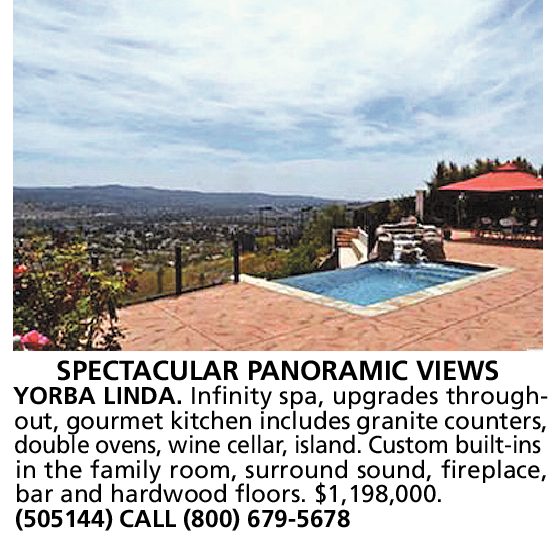 appointed, decks, SPECTACULAR PANORAMIC VIEWS YORBA LINDA. Infinity spa, upgrades throughout, gourmet kitchen includes granite counters, double ovens, wine cellar, island. Custom built-ins in the family room, surround sound, fireplace, bar and hardwood floors. $1,198,000. (505144) CALL (800) 679-5678