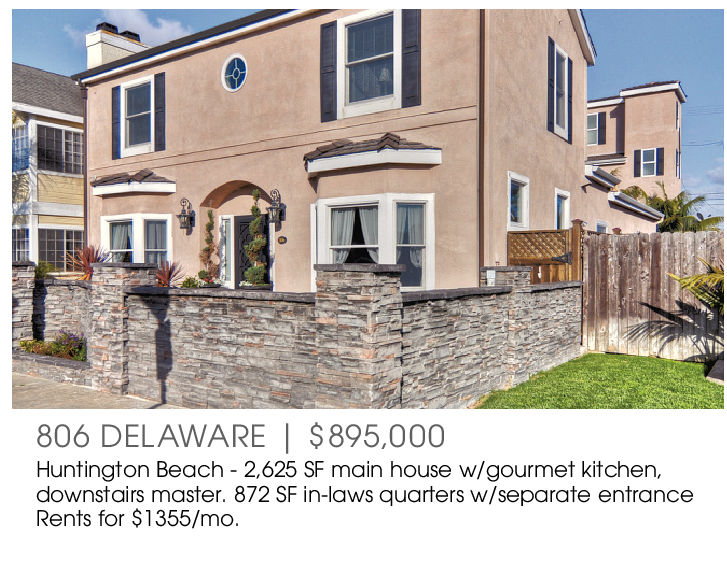806 DELAWARE | $895,000 Huntington Beach - 2,625 SF main house w/gourmet kitchen, downstairs master. 872 SF in-laws quarters w/separate entrance Rents for $1355/mo.