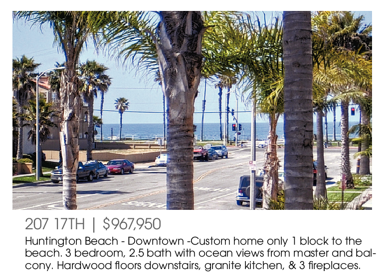 207 17TH | $967,950 Huntington Beach - Downtown -Custom home only 1 block to the beach. 3 bedroom, 2.5 bath with ocean views from master and balcony. Hardwood floors downstairs, granite kitchen, & 3 fireplaces.