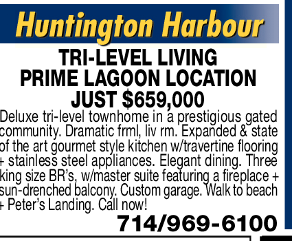 Huntington Harbour TRI-LEVEL LIVING PRIME LAGOON LOCATION JUST $659,000 Deluxe tri-level townhome in a prestigious gated community. Dramatic frml, liv rm. Expanded & state of the art gourmet style kitchen w/travertine flooring + stainless steel appliances. Elegant dining. Three king size BR’s, w/master suite featuring a fireplace + sun-drenched balcony. Custom garage. Walk to beach + Peter’s Landing. Call now! 714/969-6100 See also
