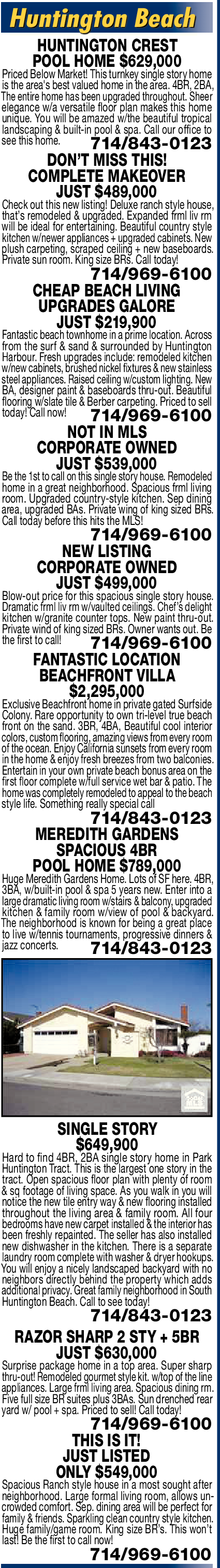 FANTASTIC LOCATION BEACHFRONT VILLA $2,295,000 Exclusive Beachfront home in private gated Surfside Colony. Rare opportunity to own tri-level true beach front on the sand. 3BR, 4BA, Beautiful cool interior colors, custom flooring, amazing views from every room of the ocean. Enjoy California sunsets from every room in the home & enjoy fresh breezes from two balconies. Entertain in your own private beach bonus area on the first floor complete w/full service wet bar & patio. The home was completely remodeled to appeal to the beach style life. Something really special call 714/843-0123 MEREDITH GARDENS
