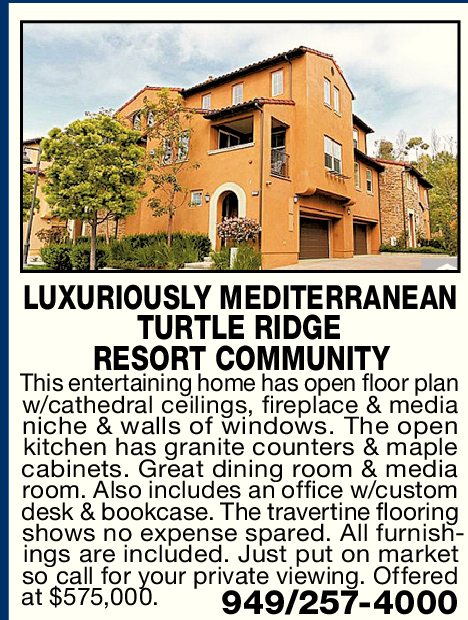 LUXURIOUSLY MEDITERRANEAN TURTLE RIDGE RESORT COMMUNITY This entertaining home has open floor plan w/cathedral ceilings, fireplace & media niche & walls of windows. The open kitchen has granite counters & maple cabinets. Great dining room & media room. Also includes an office w/custom desk & bookcase. The travertine flooring shows no expense spared. All furnishings are included. Just put on market so call for your private viewing. Offered at $575,000. 949/257-4000