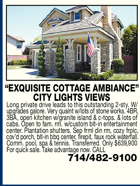 “EXQUISITE COTTAGE AMBIANCE” CITY LIGHTS VIEWS Long private drive leads to this outstanding 2-sty. W/ upgrades galore. Very quaint w/lots of stone works. 4BR, 3BA, open kitchen w/granite island & c-tops. & lots of cabs. Open to fam. rm. w/custom blt-in entertainment center. Plantation shutters. Sep frml din rm, cozy frplc, cov’d porch, blt-in bbq center, firepit, faux rock waterfall. Comm. pool, spa & tennis. Transferred. Only $639,900 For quick sale. Take advantage now. CALL 714/482-9100
