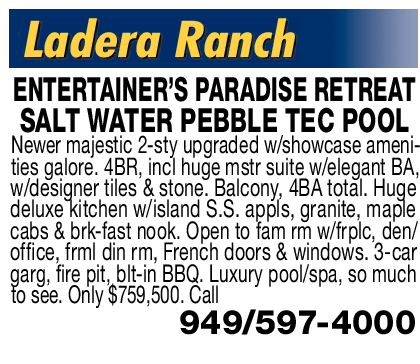 Ladera Ranch ENTERTAINER’S PARADISE RETREAT SALT WATER PEBBLE TEC POOL Newer majestic 2-sty upgraded w/showcase amenities galore. 4BR, incl huge mstr suite w/elegant BA, w/designer tiles & stone. Balcony, 4BA total. Huge deluxe kitchen w/island S.S. appls, granite, maple cabs & brk-fast nook. Open to fam rm w/frplc, den/ office, frml din rm, French doors & windows. 3-car garg, fire pit, blt-in BBQ. Luxury pool/spa, so much to see. Only $759,500. Call 949/597-4000