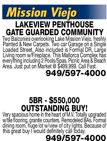 Mission Viejo LAKEVIEW PENTHOUSE GATE GUARDED COMMUNITY Two Balconies overlooking Lake Mission Viejo, freshly Painted & New Carpets. Two car Garage on a Single Loaded Street. Also included is Formal DR, Large Living room w/Fireplace. This Mallorca Complex has everything including 2 Pools/Spas. Picnic Area & Beach Area. Just put on Market @ $499,999. Call Fast. 949/597-4000 5BR - $550,000 OUTSTANDING BUY! Very spacious home in the heart of M.V. Totally upgraded w/tile flooring, granite counters. Remodeled BAs. Formal dining room, huge lot w/view of city lights. Because of this great buy I would definitely call today. 949/597-4000