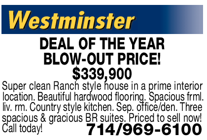 Westminster DEAL OF THE YEAR BLOW-OUT PRICE! $339,900 Super clean Ranch style house in a prime interior location. Beautiful hardwood flooring. Spacious frml. liv. rm. Country style kitchen. Sep. office/den. Three spacious & gracious BR suites. Priced to sell now! Call today! 714/969-6100