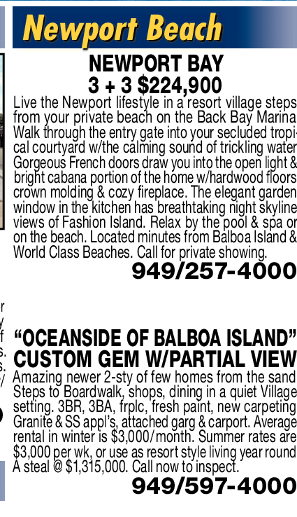 Newer by of appliances. suites. w/ 714/969-6100 Newport Beach NEWPORT BAY 3 + 3 $224,900 Live the Newport lifestyle in a resort village steps from your private beach on the Back Bay Marina. Walk through the entry gate into your secluded tropical courtyard w/the calming sound of trickling water. Gorgeous French doors draw you into the open light & bright cabana portion of the home w/hardwood fl oors, crown molding & cozy fireplace. The elegant garden window in the kitchen has breathtaking night skyline views of Fashion Island. Relax by the pool & spa or on the beach. Located minutes from Balboa Island & World Class Beaches. Call for private showing. 949/257-4000 “OCEANSIDE OF BALBOA ISLAND” CUSTOM GEM W/PARTIAL VIEW Amazing newer 2-sty of few homes from the sand. Steps to Boardwalk, shops, dining in a quiet Village setting. 3BR, 3BA, frplc, fresh paint, new carpeting. Granite & SS appl’s, attached garg & carport. Average rental in winter is $3,000/month. Summer rates are $3,000 per wk, or use as resort style living year round. A steal @ $1,315,000. Call now to inspect. 949/597-4000