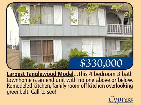 Largest Tanglewood Model...This 4 bedroom 3 bath townhome is an end unit with no one above or below. Remodeled kitchen, family room off kitchen overlooking greenbelt. Call to see!