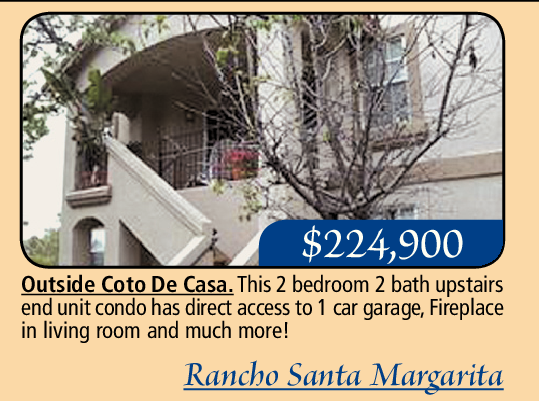 Outside Coto De Casa. This 2 bedroom 2 bath upstairs end unit condo has direct access to 1 car garage, Fireplace in living room and much more!