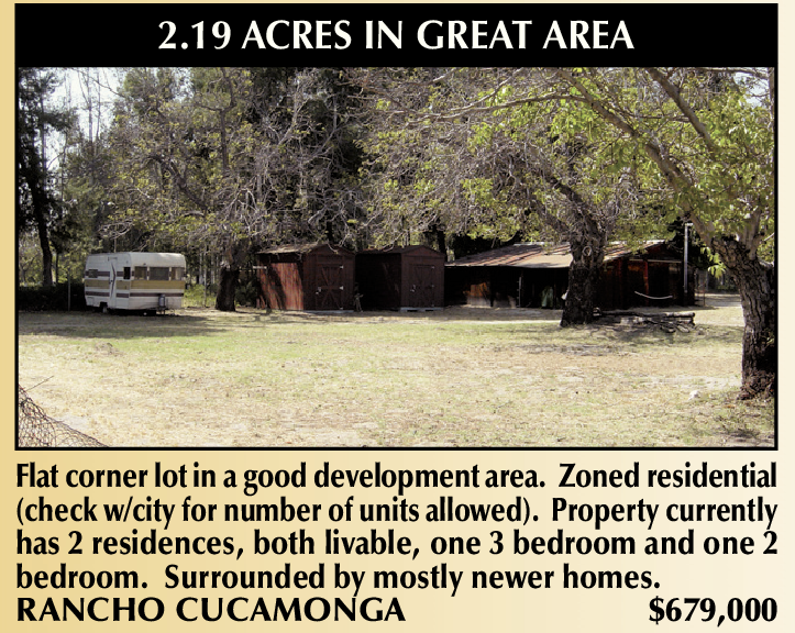 2.19 ACRES IN GREAT AREA Flat corner lot in a good development area. Zoned residential (check w/city for number of units allowed). Property currently has 2 residences, both livable, one 3 bedroom and one 2 bedroom. Surrounded by mostly newer homes. RANCHO CUCAMONGA $679,000
