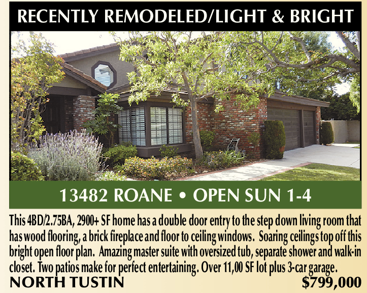 13482 ROANE • OPEN SUN 1-4 This 4BD/2.75BA, 2900+ SF home has a double door entry to the step down living room that has wood flooring, a brick fireplace and floor to ceiling windows. Soaring ceilings top off this bright open floor plan. Amazing master suite with oversized tub, separate shower and walk-in closet. Two patios make for perfect entertaining. Over 11,00 SF lot plus 3-car garage. NORTH TUSTIN $799,000