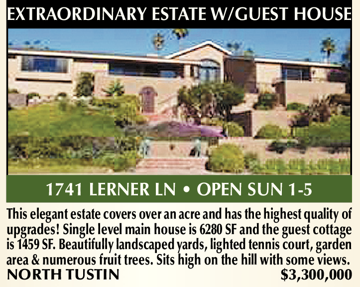 EXTRAORDINARY ESTATE W/GUEST HOUSE 1741 LERNER LN • OPEN SUN 1-5 This elegant estate covers over an acre and has the highest quality of upgrades! Single level main house is 6280 SF and the guest cottage is 1459 SF. Beautifully landscaped yards, lighted tennis court, garden area & numerous fruit trees. Sits high on the hill with some views. NORTH TUSTIN $3,300,000
