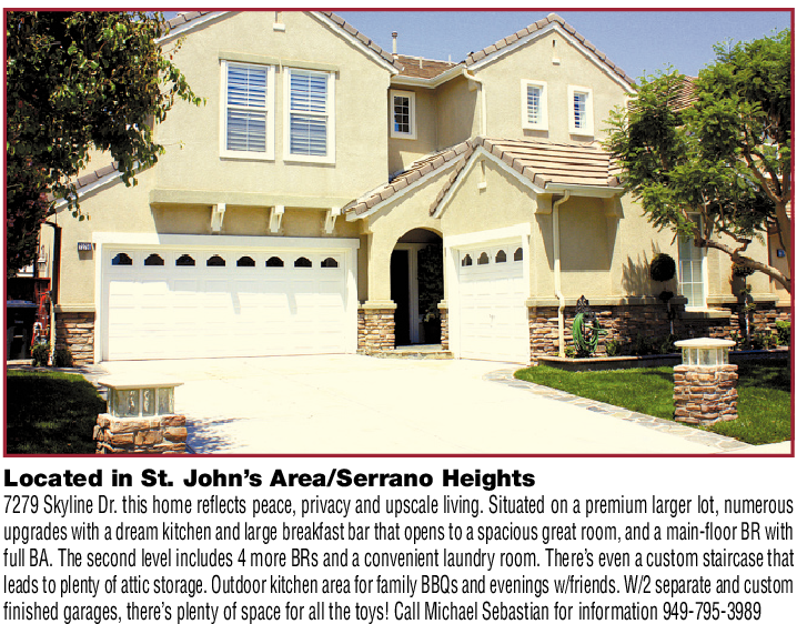Located in St. John’s Area/Serrano Heights 7279 Skyline Dr. this home reflects peace, privacy and upscale living. Situated on a premium larger lot, numerous upgrades with a dream kitchen and large breakfast bar that opens to a spacious great room, and a main-floor BR with full BA. The second level includes 4 more BRs and a convenient laundry room. There’s even a custom staircase that leads to plenty of attic storage. Outdoor kitchen area for family BBQs and evenings w/friends. W/2 separate and custom finished garages, there’s plenty of space for all the toys! Call Michael Sebastian for information 949-795-3989