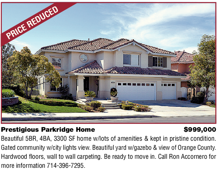 Prestigious Parkridge Home $999,000 Beautiful 5BR, 4BA, 3300 SF home w/lots of amenities & kept in pristine condition. Gated community w/city lights view. Beautiful yard w/gazebo & view of Orange County. Hardwood floors, wall to wall carpeting. Be ready to move in. Call Ron Accornero for more information 714-396-7295.