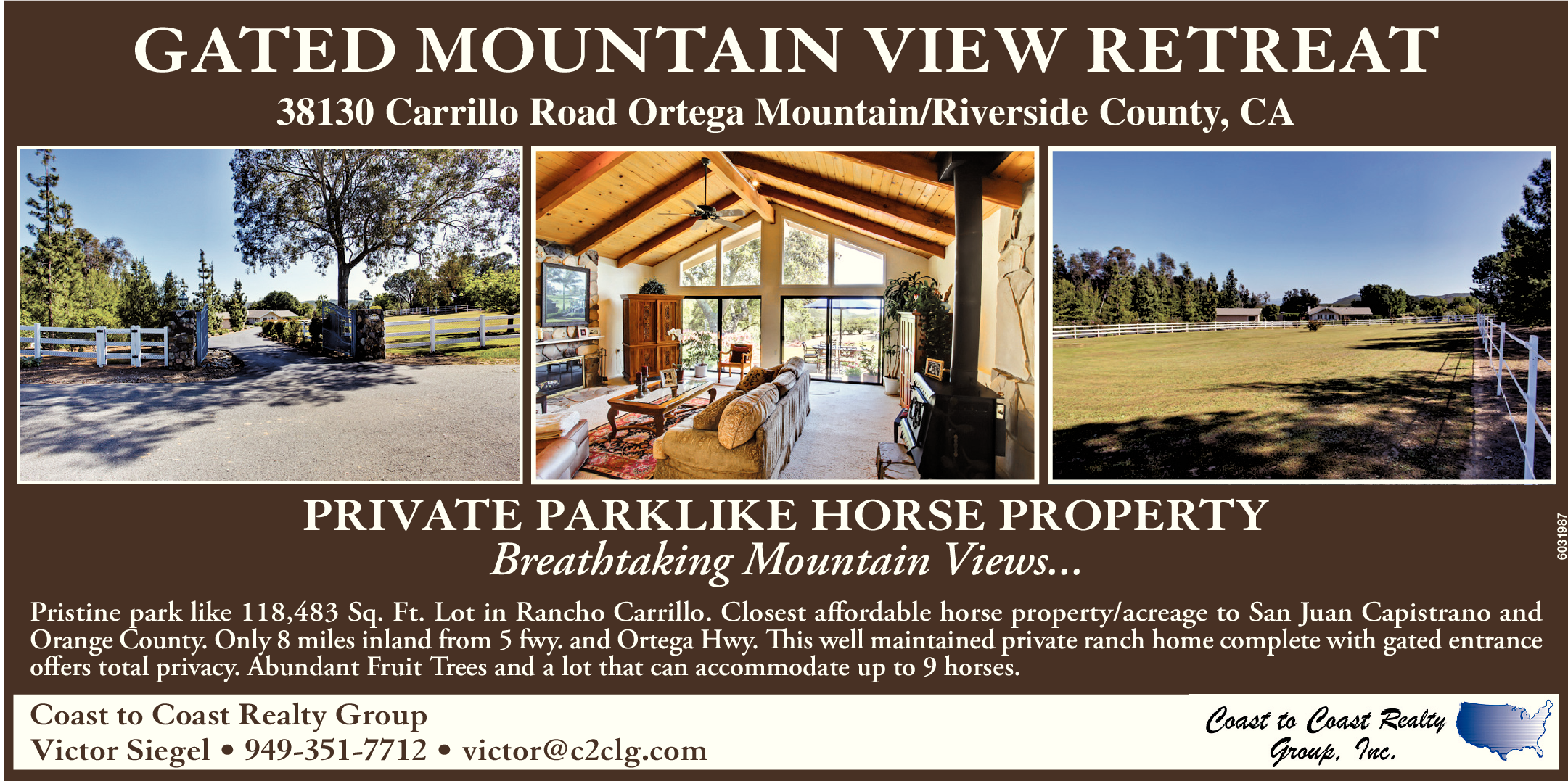 GATED MOUNTAIN VIEW RETREAT 38130 Carrillo Road Ortega Mountain/Riverside County, CA PRIVATE PARKLIKE HORSE PROPERTY Breathtaking Mountain Views... Pristine park like 118,483 Sq. Ft. Lot in Rancho Carrillo. Closest affordable horse property/acreage to San Juan Capistrano and Orange County. Only 8 miles inland from 5 fwy. and Ortega Hwy. This well maintained private ranch home complete with gated entrance offers total privacy. Abundant Fruit Trees and a lot that can accommodate up to 9 horses. Coast to Coast Realty Group Victor Siegel • 949-351-7712 • victor@c2clg.com