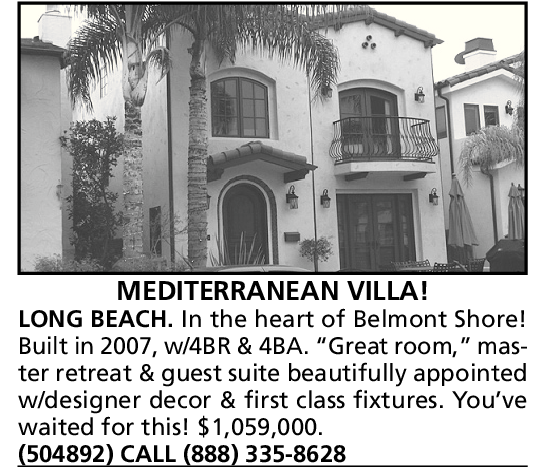 MEDITERRANEAN VILLA! LONG BEACH. In the heart of Belmont Shore! Built in 2007, w/4BR & 4BA. “Great room,” master retreat & guest suite beautifully appointed w/designer decor & first class fixtures. You’ve waited for this! $1,059,000. (504892) CALL (888) 335-8628