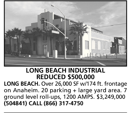 LONG BEACH INDUSTRIAL REDUCED $500,000 LONG BEACH. Over 26,000 SF w/174 ft. frontage on Anaheim. 20 parking + large yard area. 7 ground level roll-ups, 1200 AMPS. $3,249,000 (504841) CALL (866) 317-4750