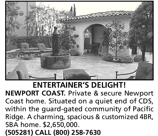 NEWPORT COAST. Private & secure Newport Coast home. Situated on a quiet end of CDS, within the guard-gated community of Pacific Ridge. A charming, spacious & customized 4BR, 5BA home. $2,650,000. (505281) CALL (800) 258-7630