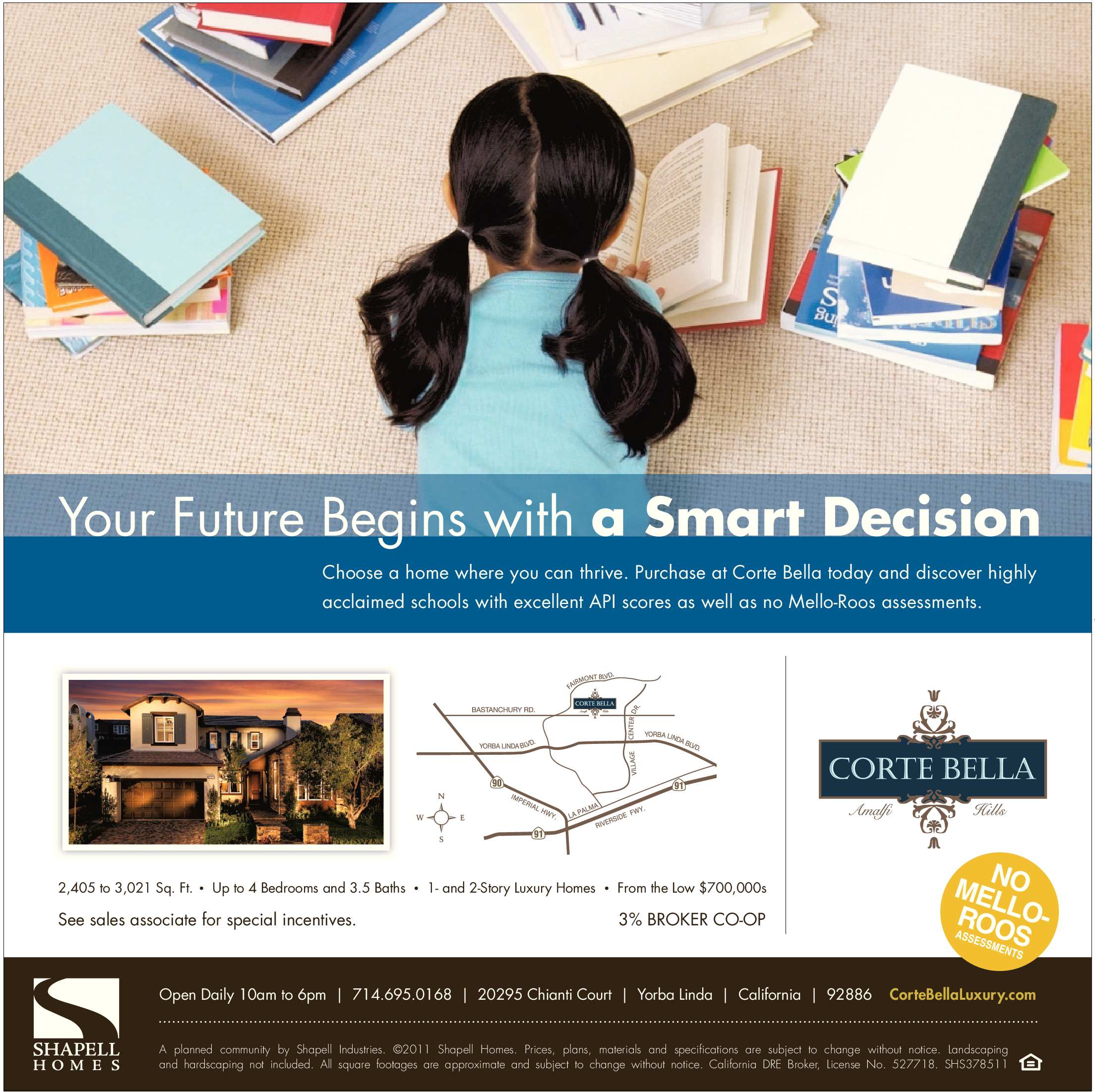 Your Future Begins with a Smart Decision Choose a home where you can thrive. Purchase at Corte Bella today and discover highly acclaimed schools with excellent API scores as well as no Mello-Roos assessments. 2,405 to 3,021 Sq. Ft. • Up to 4 Bedrooms and 3.5 Baths • 1- and 2-Story Luxury Homes • From the Low $700,000s See sales associate for special incentives. 3% BROKER CO-OP Open Daily 10am to 6pm | 714.695.0168 | 20295 Chianti Court | Yorba Linda | California | 92886 CorteBellaLuxury.com A planned community by Shapell Industries. ©2011 Shapell Homes. Prices, plans, materials and specifications are subject to change without notice. Landscaping and hardscaping not included. All square footages are approximate and subject to change without notice. California DRE Broker, License No. 527718. SHS378511