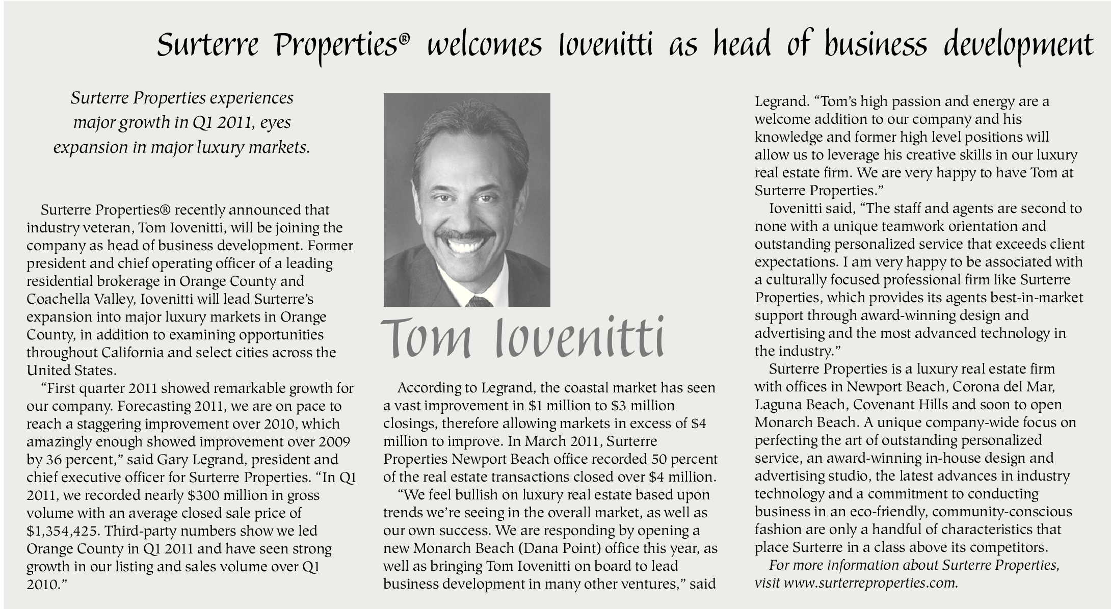 “First quarter 2011 showed remarkable growth for our company. Forecasting 2011, we are on pace to reach a staggering improvement over 2010, which amazingly enough showed improvement over 2009 by 36 percent,” said Gary Legrand, president and chief executive officer for Surterre Properties. “In Q1 2011, we recorded nearly $300 million in gross volume with an average closed sale price of $1,354,425. Third-party numbers show we led Orange County in Q1 2011 and have seen strong growth in our listing and sales volume over Q1 2010.”