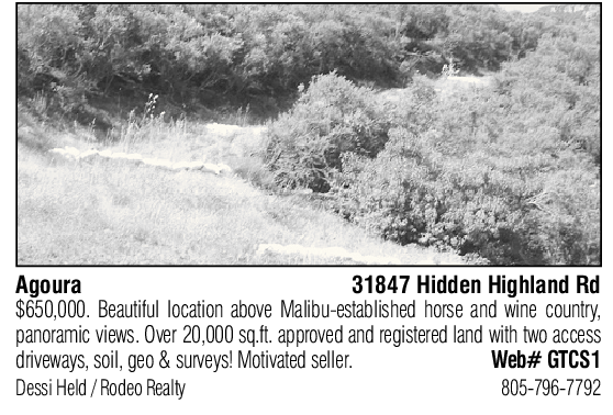 Agoura 31847 Hidden Highland Rd $650,000. Beautiful location above Malibu-established horse and wine country, panoramic views. Over 20,000 sq.ft. approved and registered land with two access driveways, soil, geo & surveys! Motivated seller. Web# GTCS1 Dessi Held / Rodeo Realty 805-796-7792