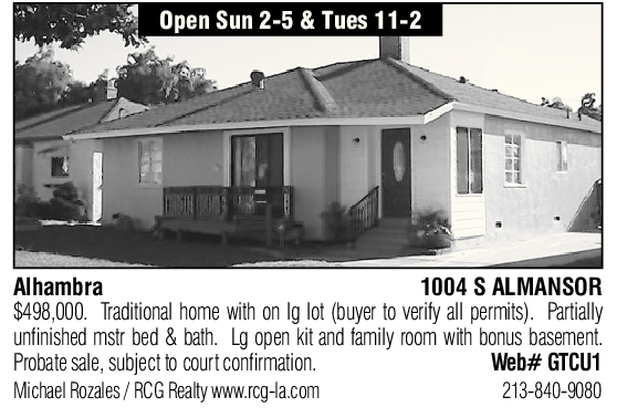 Open Sun 2-5 & Tues 11-2 Alhambra 1004 S ALMANSOR $498,000. Traditional home with on lg lot (buyer to verify all permits). Partially unfinished mstr bed & bath. Lg open kit and family room with bonus basement. Probate sale, subject to court confirmation. Web# GTCU1 Michael Rozales / RCG Realty www.rcg-la.com 213-840-9080