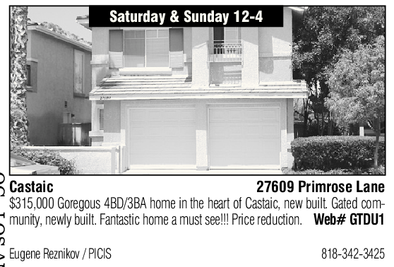 Castaic 27609 Primrose Lane $315,000 Goregous 4BD/3BA home in the heart of Castaic, new built. Gated community, newly built. Fantastic home a must see!!! Price reduction. Web# GTDU1 Eugene Reznikov / PICIS 818-342-3425