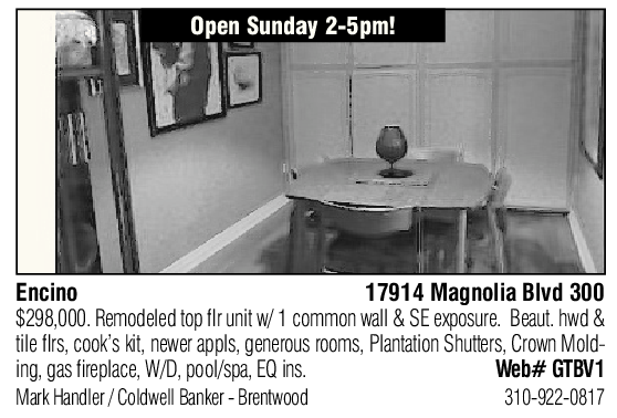 Open Sunday 2-5pm! Encino 17914 Magnolia Blvd 300 tile flrs, cook’s kit, newer appls, generous rooms, Plantation Shutters, Crown Mold $298,000. Remodeled top flr unit w/ 1 common wall & SE exposure. Beaut. hwd & ing, gas fireplace, W/D, pool/spa, EQ ins. Web# GTBV1 Mark Handler / Coldwell Banker - Brentwood 310-922-0817