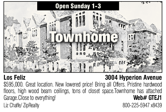 Open Sunday 1-3 Los Feliz 3004 Hyperion Avenue $595,000. Great location. New lowered price! Bring all Offers. Pristine hardwood Garage.Close to everything! Web# GTEJ1 floors, high wood beam ceilings, tons of closet space.Townhome has attached Liz Chaffe/ ZipRealty 800-225-5947 x8439