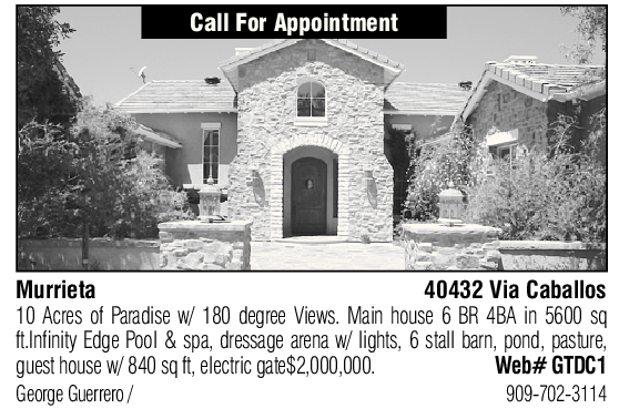 Murrieta 40432 Via Caballos 10 Acres of Paradise w/ 180 degree Views. Main house 6 BR 4BA in 5600 sq guest house w/ 840 sq ft, electric gate$2,000,000. Web# GTDC1 ft.Infinity Edge Pool & spa, dressage arena w/ lights, 6 stall barn, pond, pasture, George Guerrero / 909-702-3114